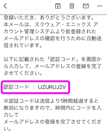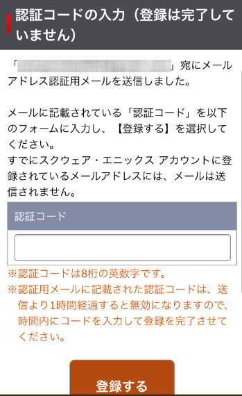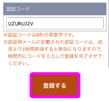 すると認証コードを入力する画面になりました。しばらく待っていると登録したメールアドレスに8桁の英数字が記載されたメールが届きます。