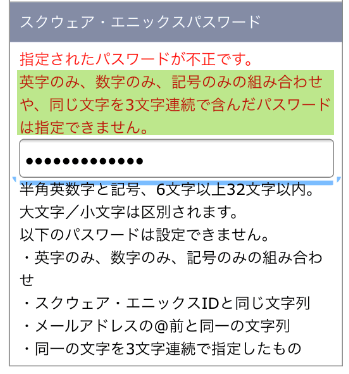 なお、パスワードは英字と数字、もしくは記号の3つのうちの最低2つを組み合わせないとこのように注意されてしまいます。