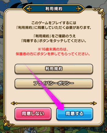 ドラクエウォークを始めるときに表示された「利用規約」が再び表示されました。「同意する」をタップします。
