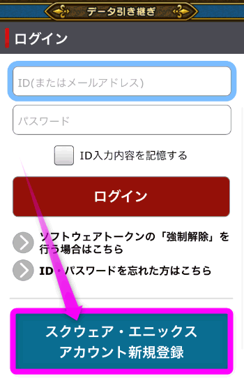 もし、すでに「SQUARE ENIX ACCOUNT」に登録済みの場合はIDとパスワードを入力してログインします。