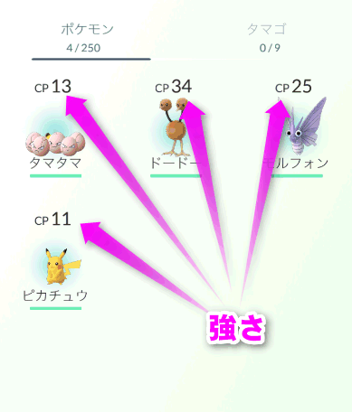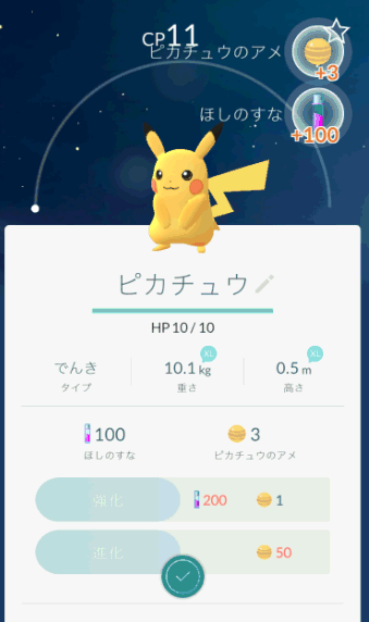ちなみに「強さ」を表示させると、ピカチュウは「CP11」でそれほど強くないことが分かります。