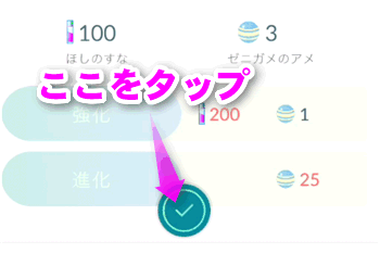 ゲットしたポケモンのプロフィールを確認したら、チェックマークをタップします。