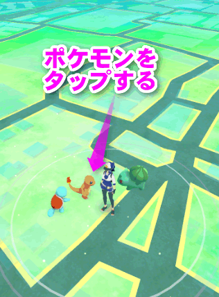 トレーナーの近くにいるポケモンのアイコンから、ゲットしたいポケモンをタップします。