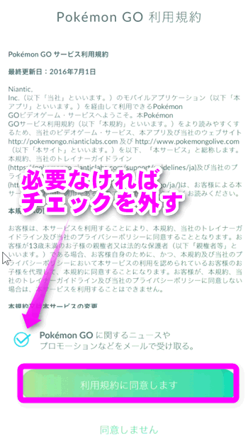 なお、Pokémon GOに関するニュースやプロモーションなどのメールを受け取りたくない場合は、チェックを外しておきます。