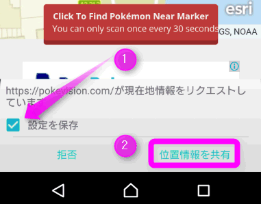 エクスペリアなどの場合は、画面下にこのような表示が現れるので、「設定を保存」にチェックがついていることを確認し、②「位置情報を共有」をタップします。