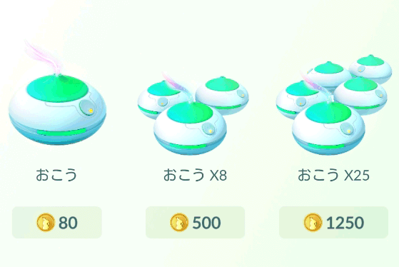 1個80コイン(96円)ですが、8個だと500コイン(600円。1個当たり75円)、25個で1250コイン(1500円。1個当たり60円)となっていて、まとめて購入したほうが1個当たりの価格が安くなるようです。