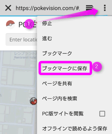 エクスペリアの場合、「Poke Vision」を表示させたら右上の①の部分をタップ。②の「ブックマークに保存」をタップします。