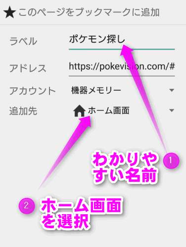 この「Poke Vision」のページをホーム画面に配置しておくと、すぐに調べることができます。やり方は以下。