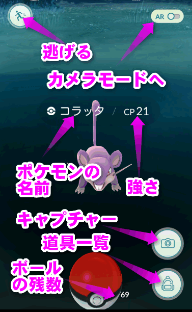ポケモンに遭遇すると、このような画面になります。