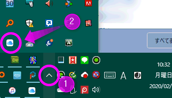 インストールが完了すると、自動で起動しているので、タスクバーにあるiCloudのアイコン(画像の②参照)をクリックします。