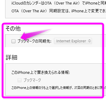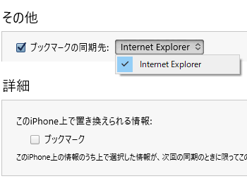 パソコンと直接繋げて同期したブックマークを削除する場合は、iTunesの「その他」の「ブックマークの同期先」のチェックを外して