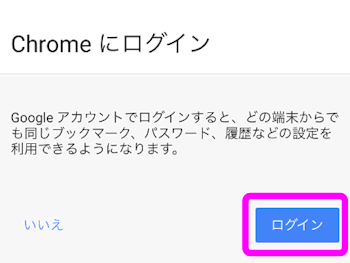 アプリをインストールすると、「Chromeにログイン」という画面が表示されるので、パソコンで使用しているGoogleアカウントでログインします。
