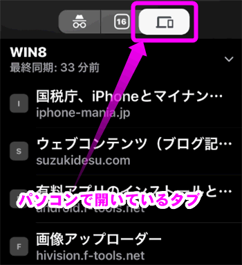 iPhoneのChromeアプリで、パソコンで見ているタブを表示させているところ。