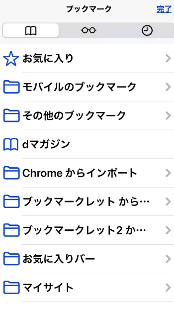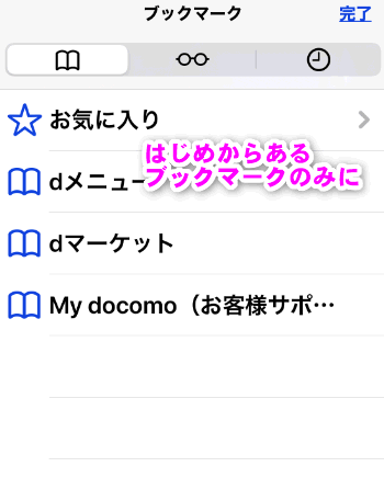 Safariのブックマークを開いてみると、最初からあるキャリア用のブックマークのみになりました。