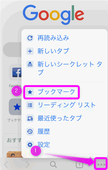 Chromeアプリのブックマークは、①のメニューボタンの中の②にあります。