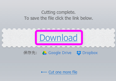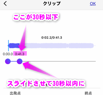 着メロにしたい部分を抽出します。30秒以内になるように丸いアイコン2つをスライドさせてください。左の丸が、開始位置。右側が終了位置です。