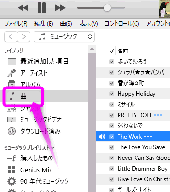 続いてiTunesの左側の「曲」などをクリックし、着信音に設定したい曲を表示させます。