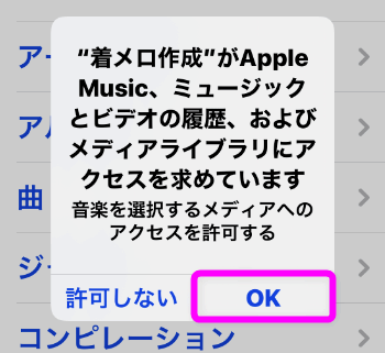 はじめて使用する場合は、このようにメディアへのアクセスを許可するか聞いてくるので、「OK」をタップします。