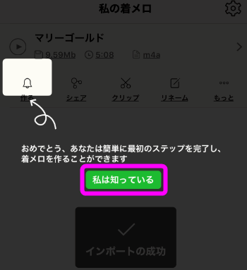 はじめて着メロメーカーを立ち上げるとこのような使い方が表示されるので、「私は知っている」をタップします。