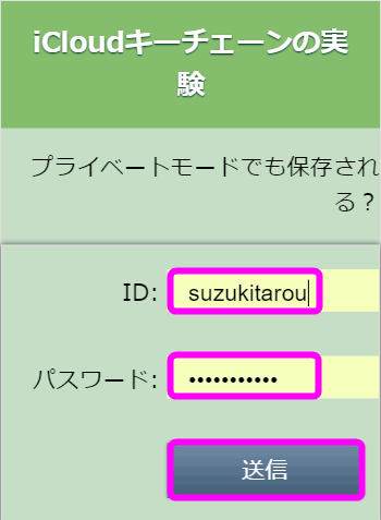 ChromeにIDとパスワードを保存させるには、入力欄に入力したあと送信するだけです。