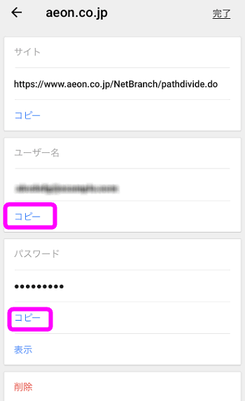 保存されているID(ユーザー名)とパスワード、そして保存したURLが表示されます。