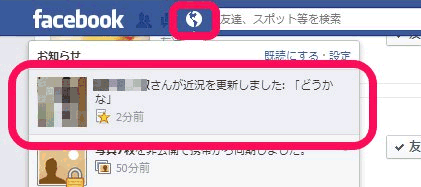 特定の人の更新を通知するような設定にすると、パソコン版のFacebookでも通知(地球儀のアイコンのところに赤い丸が表示される)されるようです。