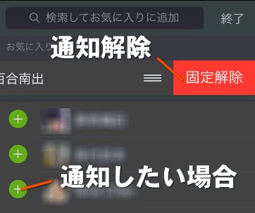 特定の人の更新があると、スマートフォンの通知センターに通知するようにするには、緑色の丸をタップします。