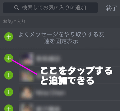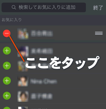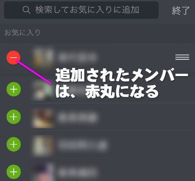 お気に入りに登録した友だちは、「編集」をタップした時にこのように赤丸になります。