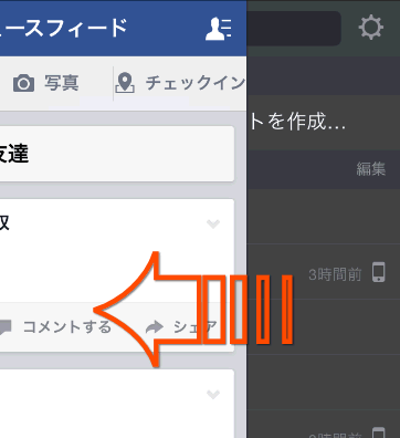 Facebookのアプリを立ち上げ、基本画面を表示させたら、そのまま指で右から左へスワイプします。