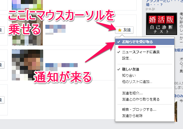 ひとりひとり、友達の名前の右側に「友達」というようなボタンがあるので、このボタンの上にマウスカーソルを載せます(この時クリックしないでください)。