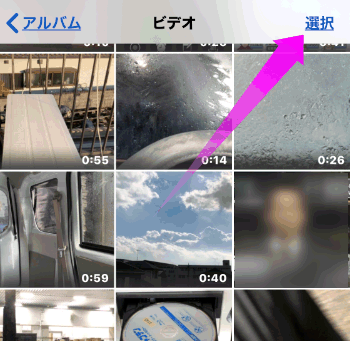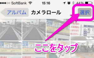 「写真」を開いたら「カメラロール」を表示させ、右上の「選択」をタップします。