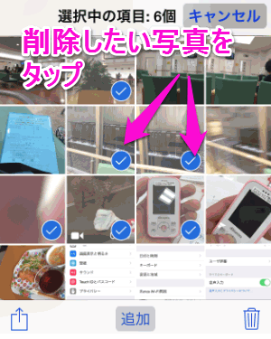 削除したい写真をタップして、青い丸のチェックマークを付けます。