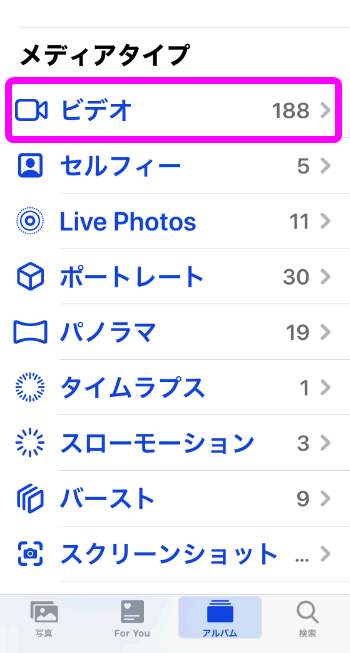 例えばiPhoneで撮影した動画をすべて削除したい場合は、「ビデオ」をタップします。