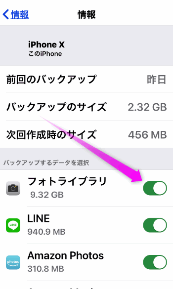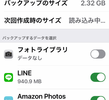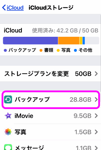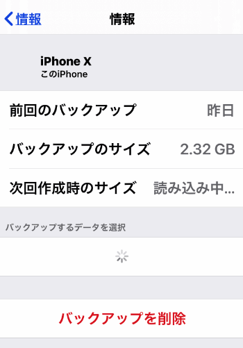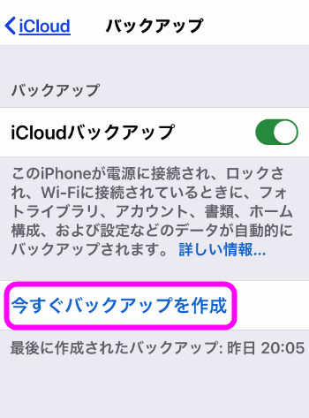 この状態でバックアップします。1つ戻って「iCloudバックアップ」をタップします。