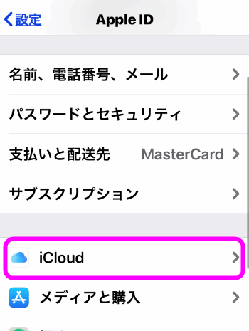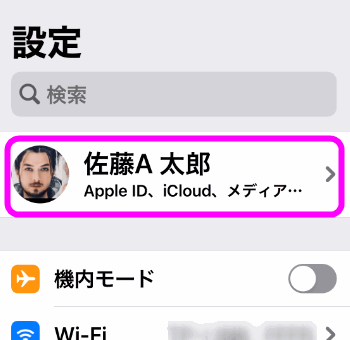 設定を開き、一番上の自分の名前の部分(もしくはApple IDの部分)をタップします。