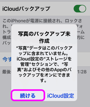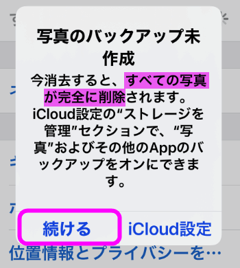 この時、写真がバックアップされませんというような警告が表示されますが、「続ける」をタップします。
