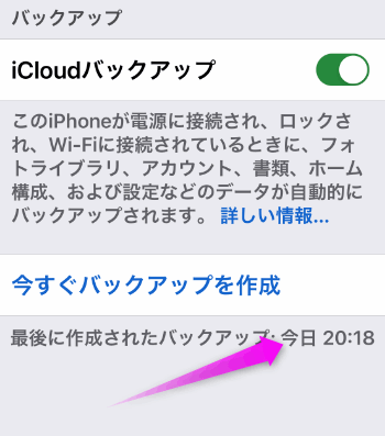 しばらく待っているとバックアップが完了します。この時必ず、「最後に作成されたバックアップ」が「今日」と表示されていることを確認してください。