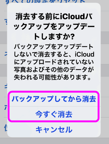 まだバックアップが住んでいない場合は、「バックアップしてから消去」を選択してください。