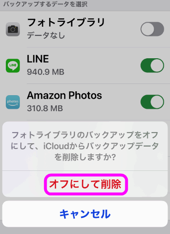 確認画面が表示されるので、「オフにして削除」をタップします。
