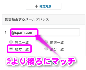 特定のドメイン(「@マーク」より後ろの部分)のメールは全て拒否したい場合は、このように「@マーク」より下を入力し、「後方一致」にチェックを入れてください。