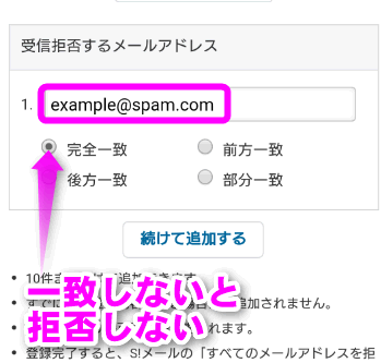 特定のメールアドレスを拒否したい場合は、拒否したいメールアドレスを入力し、「完全一致」にチェックを入れてください。
