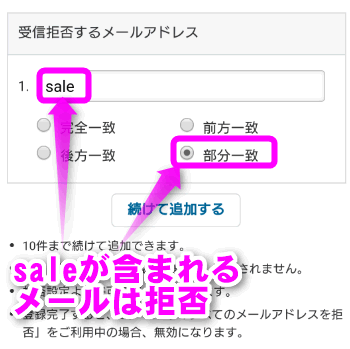 特定の文字列を含むメールアドレスを全て拒否したい場合は、その文字列を入力し、「部分一致」にチェックを入れてください。