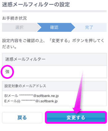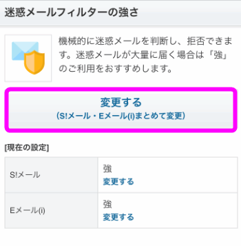 「迷惑メールフィルターの強さ」にある「変更する」をタップします。