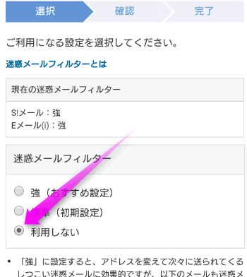 もし、大事なメールが届かないという場合は、迷惑メール設定をオフにしてください。