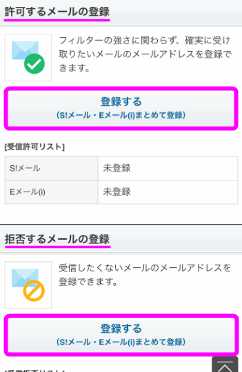 下の方にスクロールしていくと、「許可するメールの登録」と「拒否するメールの登録」があります。