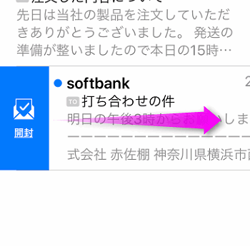 左から右にスワイプすると、既読用の「開封」というボタンが表示されるので、ここをタップすると既読状態になります。