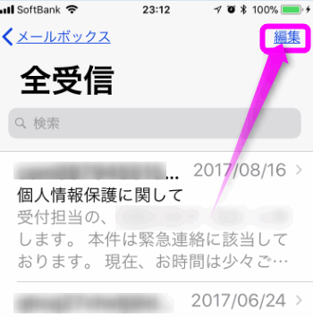 複数のメールをまとめて既読にしたり、削除したい場合は、右上の「編集」をタップします。