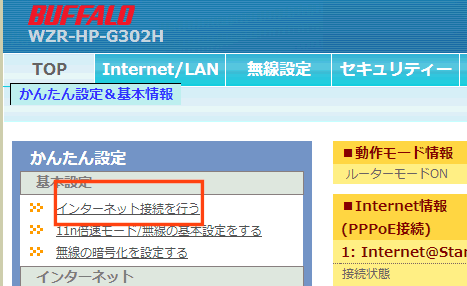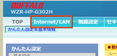 ルーターの設定画面で、上の「Internet/LAN」という部分をクリックします。