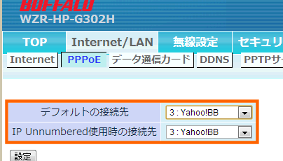 続いて表示された画面の「デフォルトの接続先」と「IP Unnumberd使用時の接続先」を先ほど入力した「接続先名称」にして、「設定」ボタンをクリックします。