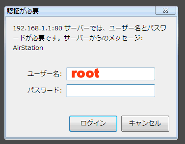このようにユーザー名とパスワードを要求してくるので、「ユーザー名」のところに「root」と入力して「ログイン」ボタンをクリックします。